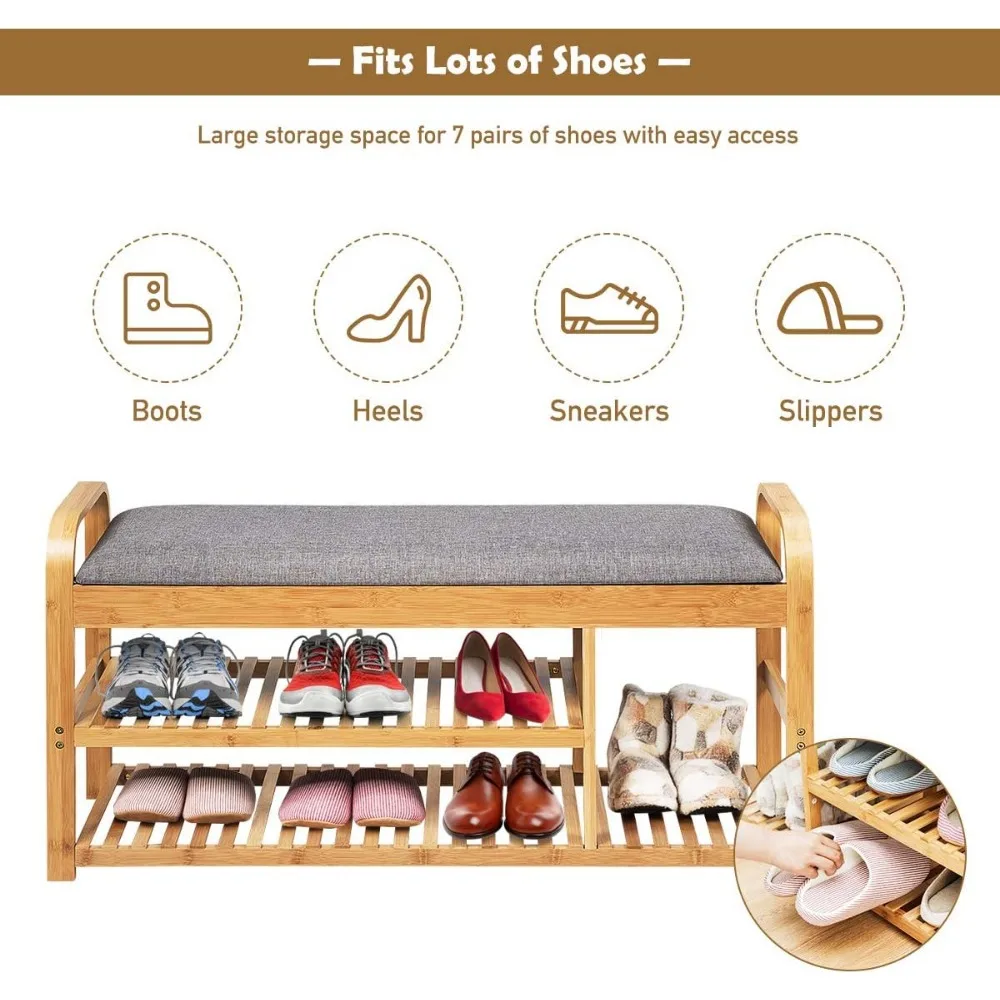 This shoe rack organizer bench is a three-tiered solution designed to accommodate a variety of shoe styles, including boots, high heels, slippers, and sneakers. It features two distinct height levels, 5.5 inches and 12 inches, allowing for the storage of up to seven pairs of shoes.