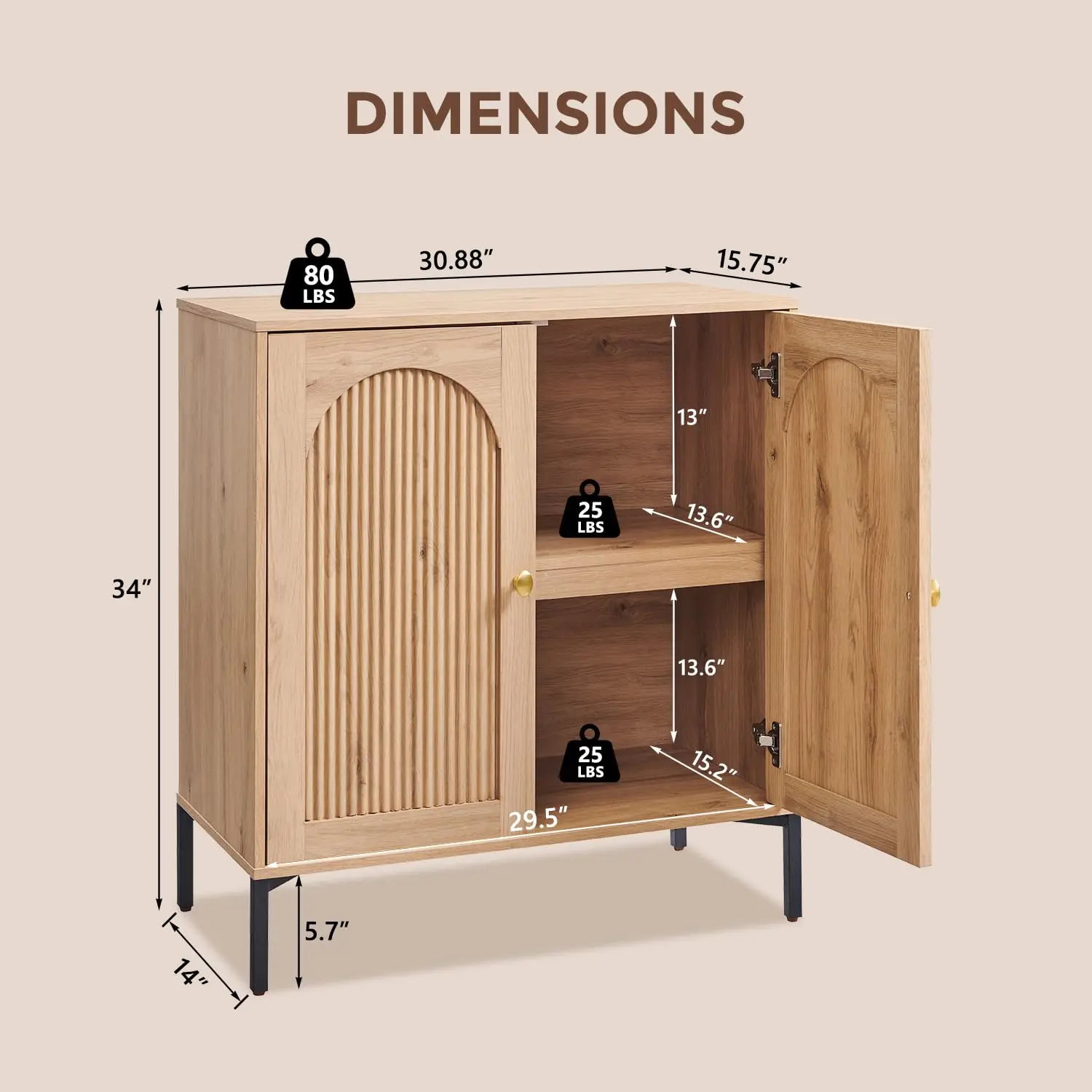 Large Capacity Buffet Cabinet. This wooden storage cabinet (15.75″D x 30.88″W x 34″H) offers ample storage behind its double doors. It features an adjustable wooden shelf that can be set to three different heights, flexibly meets storage needs for bathroom essentials, towels, or small appliances.