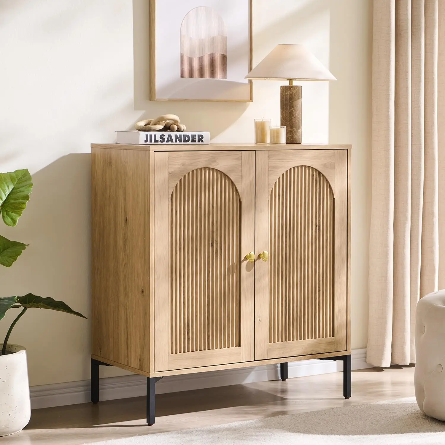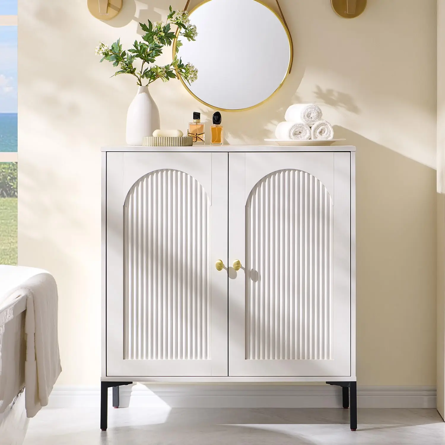 Elegant Symmetrical Fluted Arched Cabinet. Bathroom Storage Cabinet features meticulously carved arched fluted panels that create captivating light and shadow effects, adding a touch of modern artistry to your living space. This mid-century modern storage cabinet not only boasts exquisite aesthetics but also offers a delightful tactile experience. It effectively resists fingerprints and minor scratches, maintaining a pristine appearance with ease