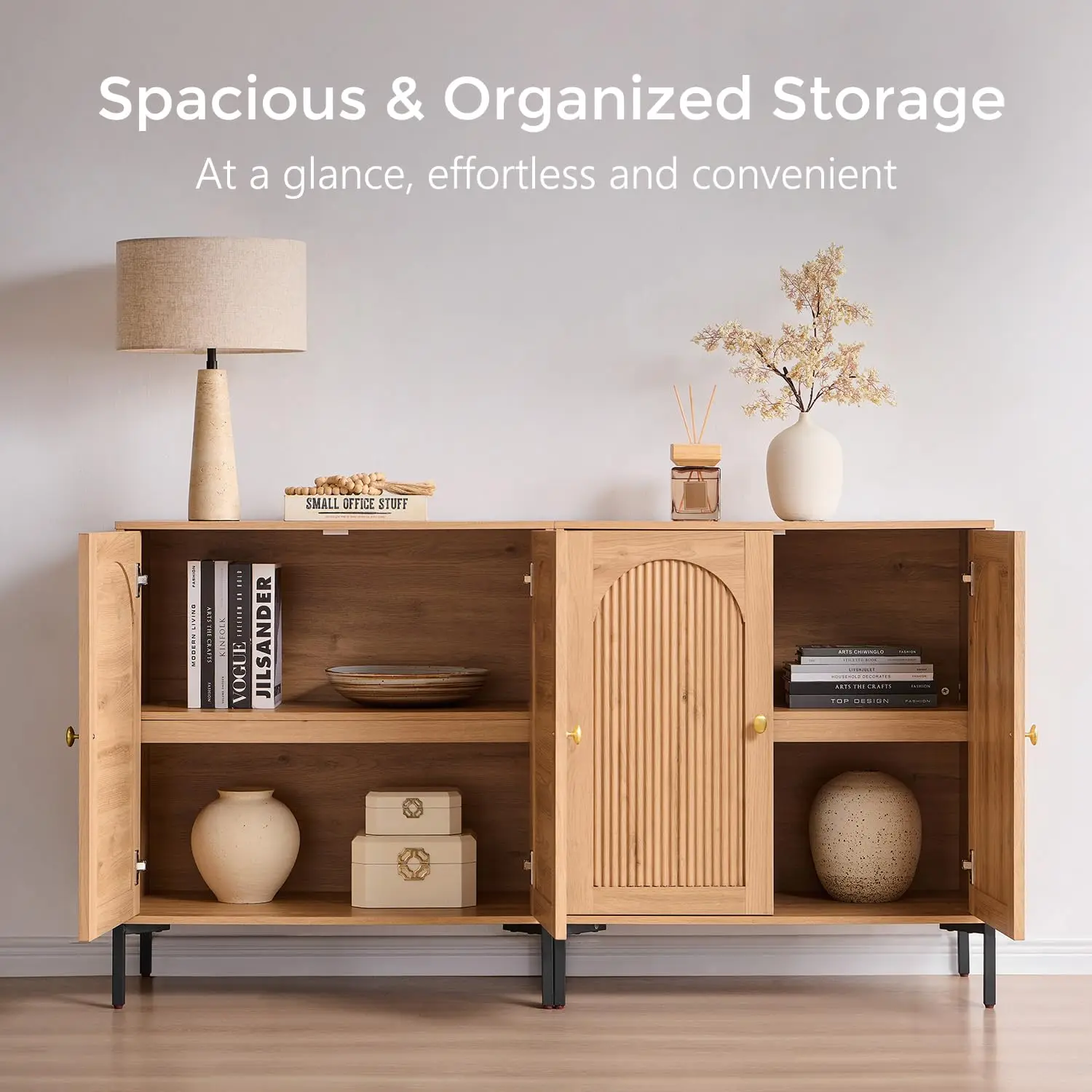 Adapts to Any Space. This decorative side cabinet fits right in anywhere in your home. It works perfectly as a storage solution in the bathroom, a display shelf for your favorite decor, or a versatile organizer. Whether placed in the bath, dining room, living area, or entryway, it functions seamlessly as a vanity, sideboard, kitchen storage, media console, or catch-all cupboard. It meets all your storage and display needs while enhancing both the functionality and aesthetic appeal of your space.