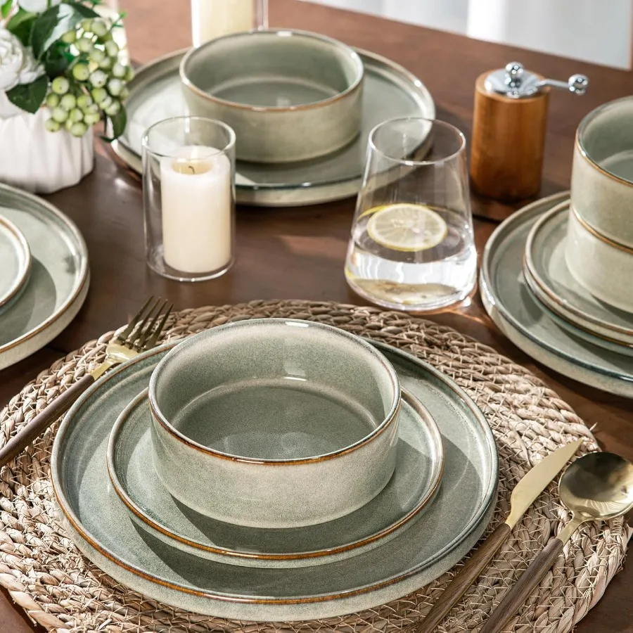 Elevate your everyday dining with this elegant 12-Piece Stoneware Dinnerware Set. Featuring a soft, earthy green glaze with subtle speckled detailing and warm brown rims, this set brings modern rustic charm to any table. Crafted from durable stoneware, each piece is designed for everyday use while maintaining a refined, artisanal look.